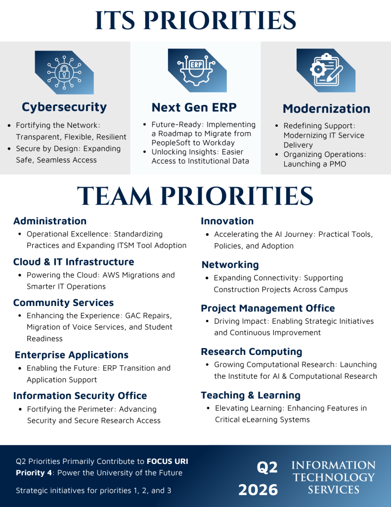 Each quarter, the Information Technology Services (ITS) team will outline our top priorities and those of each team within the department. This initiative aims to provide clarity and transparency regarding our goals and how they align with the broader strategic priorities of the University of Rhode Island (URI). By sharing these priorities, we hope to foster collaboration, drive strategic focus, and ensure our efforts are consistently aligned with the University’s mission to advance knowledge, promote innovation, and enhance the experience of our entire community.